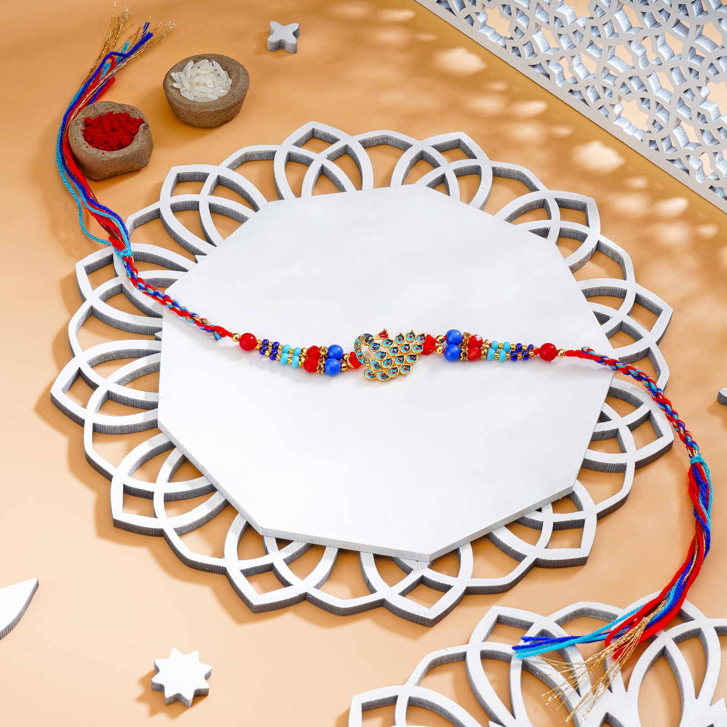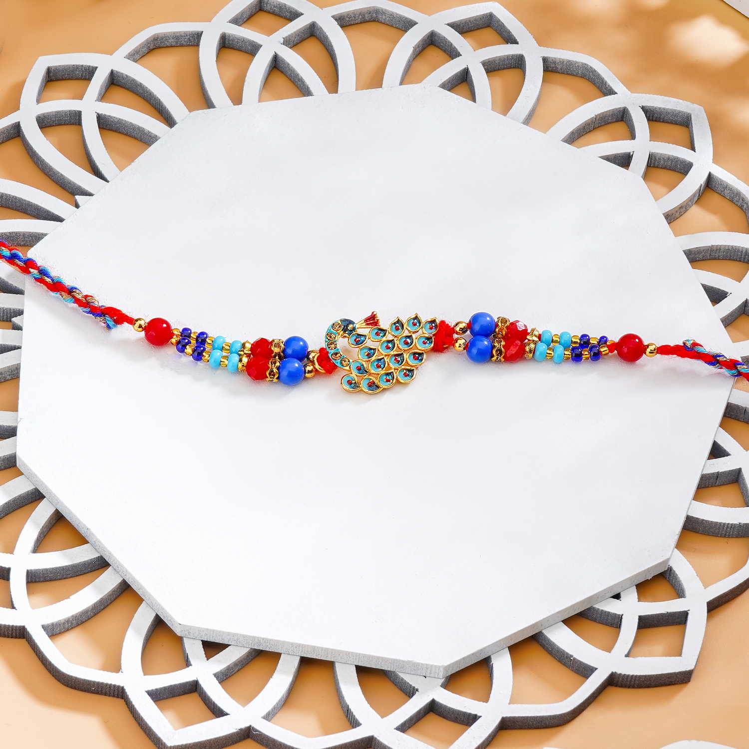 Send a Beautifully Crafted Peacock Feather Rakhi to your brother with a heartfelt personal message. To make it more special we are giving exclusive free gifts like greeting Card, chocolate and Bhgwan Rakhi along with this Rakhi. To make him feel special, you can customize your Rakhi combo with our add-on products and let him know how blessed you are to have him into your life.