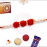 Send a Special Delicate Red Velvet Bead Rakhi with Pearls to your brother with a heartfelt personal message. To make it more special we are giving exclusive free gifts like greeting Card, Roli-Chawal, chocolate and Bhgwan Rakhi along with this Rakhi. To make him feel special, you can customize your Rakhi combo with our add-on products and let him know how blessed you are to have him into your life.