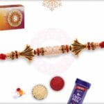 Send a Special Exclusive Pearl Rakhi with Diamonds to your brother with a heartfelt personal message. To make it more special we are giving exclusive free gifts like greeting Card, Roli-Chawal, chocolate and Bhgwan Rakhi along with this Rakhi. To make him feel special, you can customize your Rakhi combo with our add-on products and let him know how blessed you are to have him into your life.