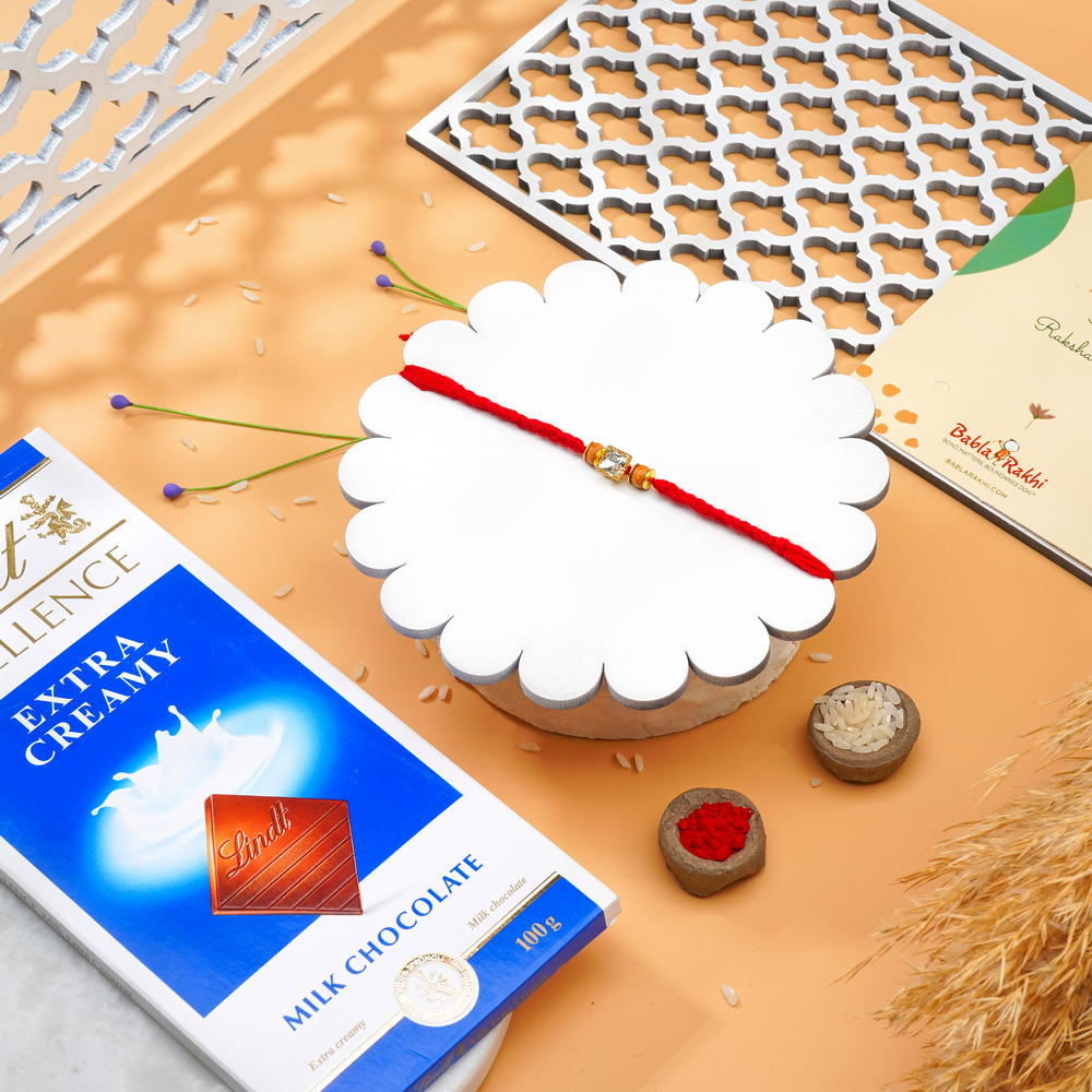 Send a Rakhi with Lindt Excellence to your brother with a heartfelt personal message. To make it more special we are giving exclusive free gifts like greeting Card, chocolate and Bhgwan Rakhi along with this Rakhi. To make him feel special, you can customize your Rakhi combo with our add-on products and let him know how blessed you are to have him into your life.