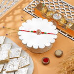 Send a Rakhi with Kaju Katri (200gm) and Ferrero Rocher (4pc) to your brother with a heartfelt personal message. To make it more special we are giving exclusive free gifts like greeting Card, chocolate and Bhgwan Rakhi along with this Rakhi. To make him feel special, you can customize your Rakhi combo with our add-on products and let him know how blessed you are to have him into your life.