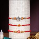 Send a Three Set Rakhi to your brother with a heartfelt personal message. To make it more special we are giving exclusive free gifts like greeting Card, Roli-Chawal, chocolate and Bhgwan Rakhi along with this Rakhi. To make him feel special, you can customize your Rakhi combo with our add-on products and let him know how blessed you are to have him into your life.