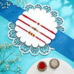 Send a Three Set Rakhi to your brother with a heartfelt personal message. To make it more special we are giving exclusive free gifts like greeting Card, Roli-Chawal, chocolate and Bhgwan Rakhi along with this Rakhi. To make him feel special, you can customize your Rakhi combo with our add-on products and let him know how blessed you are to have him into your life.