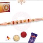 Send a Special Traditional Pearl Rakhi with Red Thread to your brother with a heartfelt personal message. To make it more special we are giving exclusive free gifts like greeting Card, Roli-Chawal, chocolate and Bhgwan Rakhi along with this Rakhi. To make him feel special, you can customize your Rakhi combo with our add-on products and let him know how blessed you are to have him into your life.